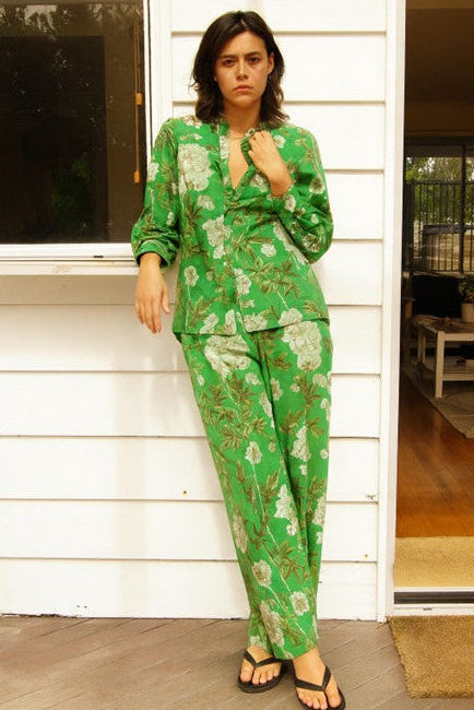 The Dahlia Long Sleeve Shirt, a timeless piece in 100% cotton voile with an enchanting green botanical print. The mandarin collar and front button closure pair with convertible long sleeves; roll them up to suit your mood and occasion. Lightweight and breathable, this shirt transitions effortlessly through seasons and works beautifully as a standalone layer or coordinated with the full Dahlia collection for versatile styling.